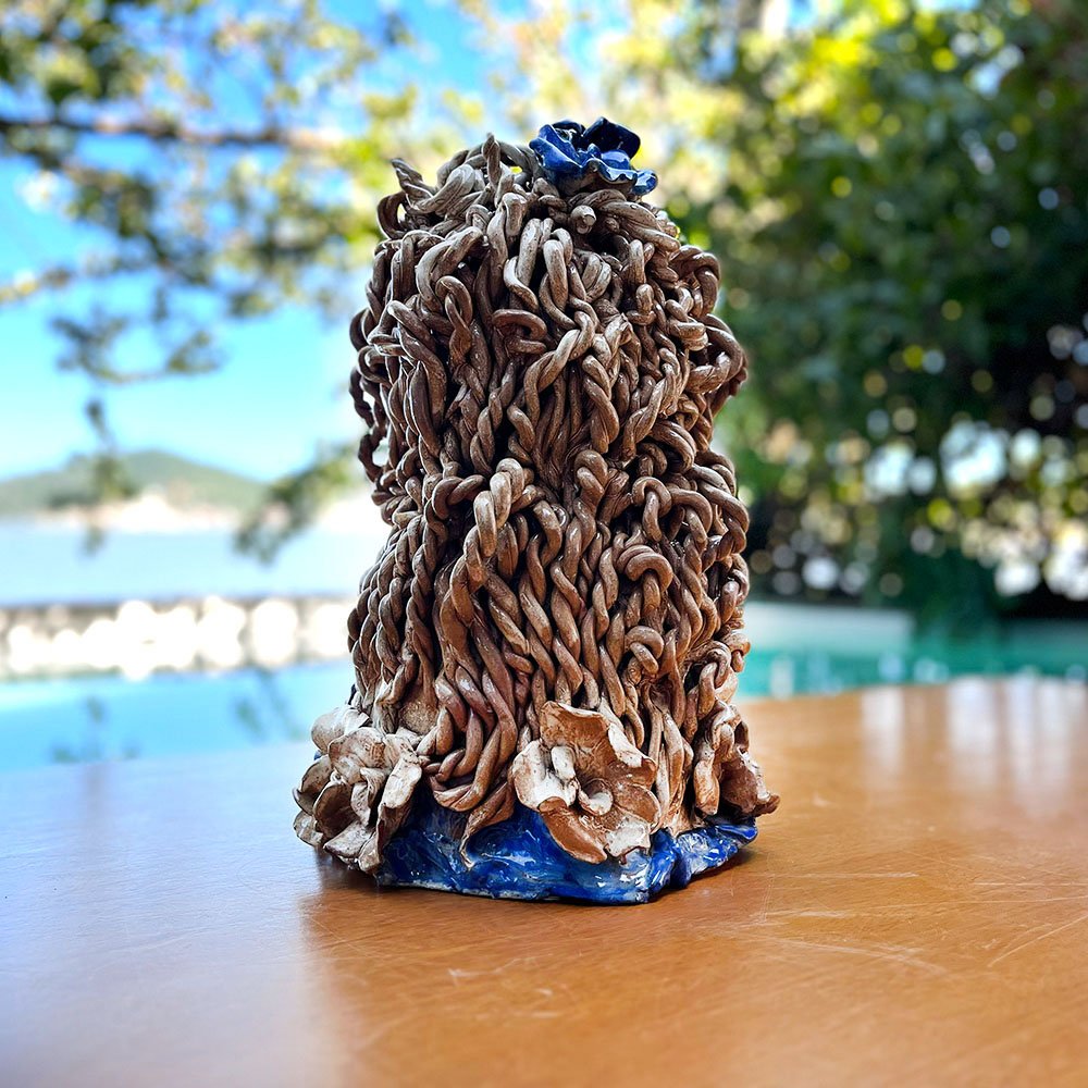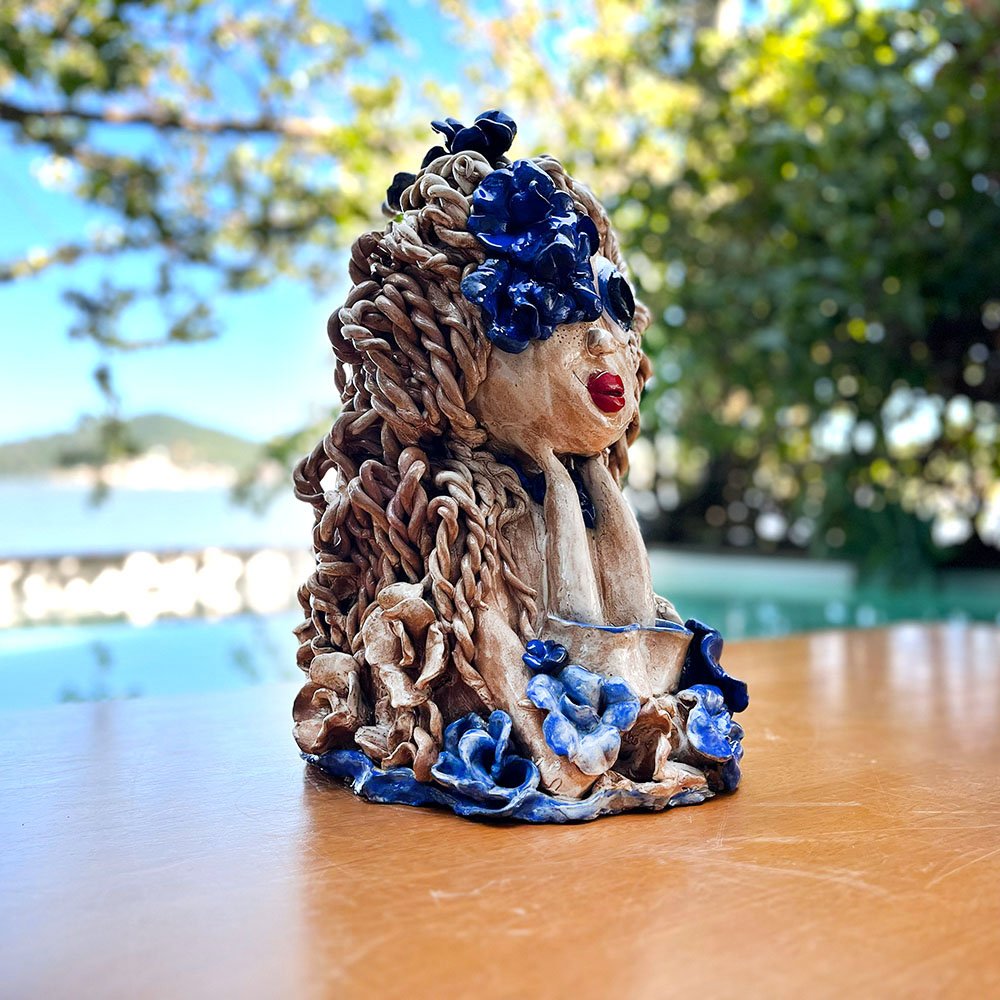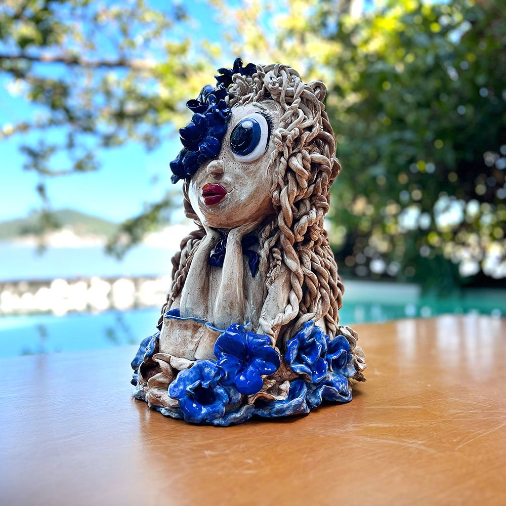 O design desta obra é uma celebração da textura e do volume. Com dimensões generosas, ela impressiona pelo trabalho minucioso nos cabelos, formados por centenas de “fios” de argila entrelaçados manualmente, criando uma experiência tátil irresistível. O contraste cromático é sofisticado: o azul cobalto vibrante das flores e do grande olho expressivo se destaca sobre a base bege natural da pele, enquanto os lábios vermelhos adicionam um toque de paixão e vida. O acabamento alterna entre o rústico da argila crua e o vitrificado brilhante dos esmaltes, capturando a luz de forma dinâmica.