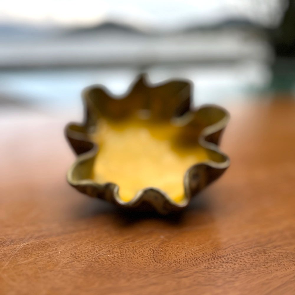O design desta obra é focado no contraste dramático. A borda, modelada com dobras acentuadas, cria um ritmo visual que guia o olhar para o centro da peça. O esmalte amarelo interno é liso, brilhante e saturado, oferecendo uma sensação de calor e alegria. Em contrapartida, o exterior apresenta nuances metálicas e terrosas (bronze/marrom), conferindo peso e nobreza. Essa dicotomia torna a peça visualmente magnética e tátil, perfeita para ser manuseada e admirada de perto.