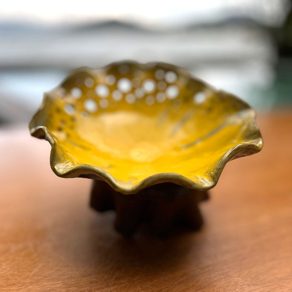 A escultura da base e a distribuição aleatória dos furos na borda são decisões artísticas tomadas no momento da modelagem. Não há moldes industriais. Ao adquirir o Centro de Mesa de Cerâmica com Pé Escultural e Vazados Amarelo, você leva para casa uma obra irreplicável, uma peça que carrega a marca da mão humana e a energia do fogo.