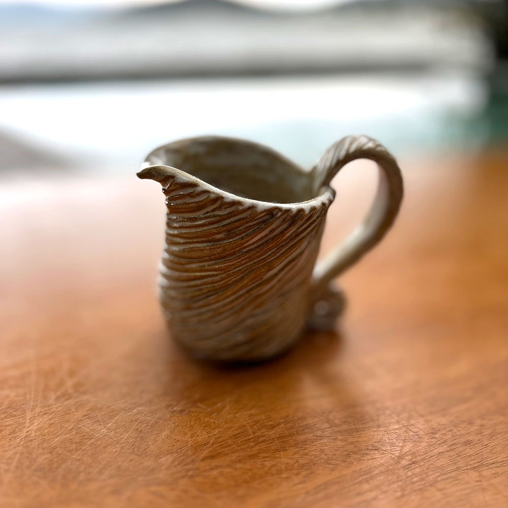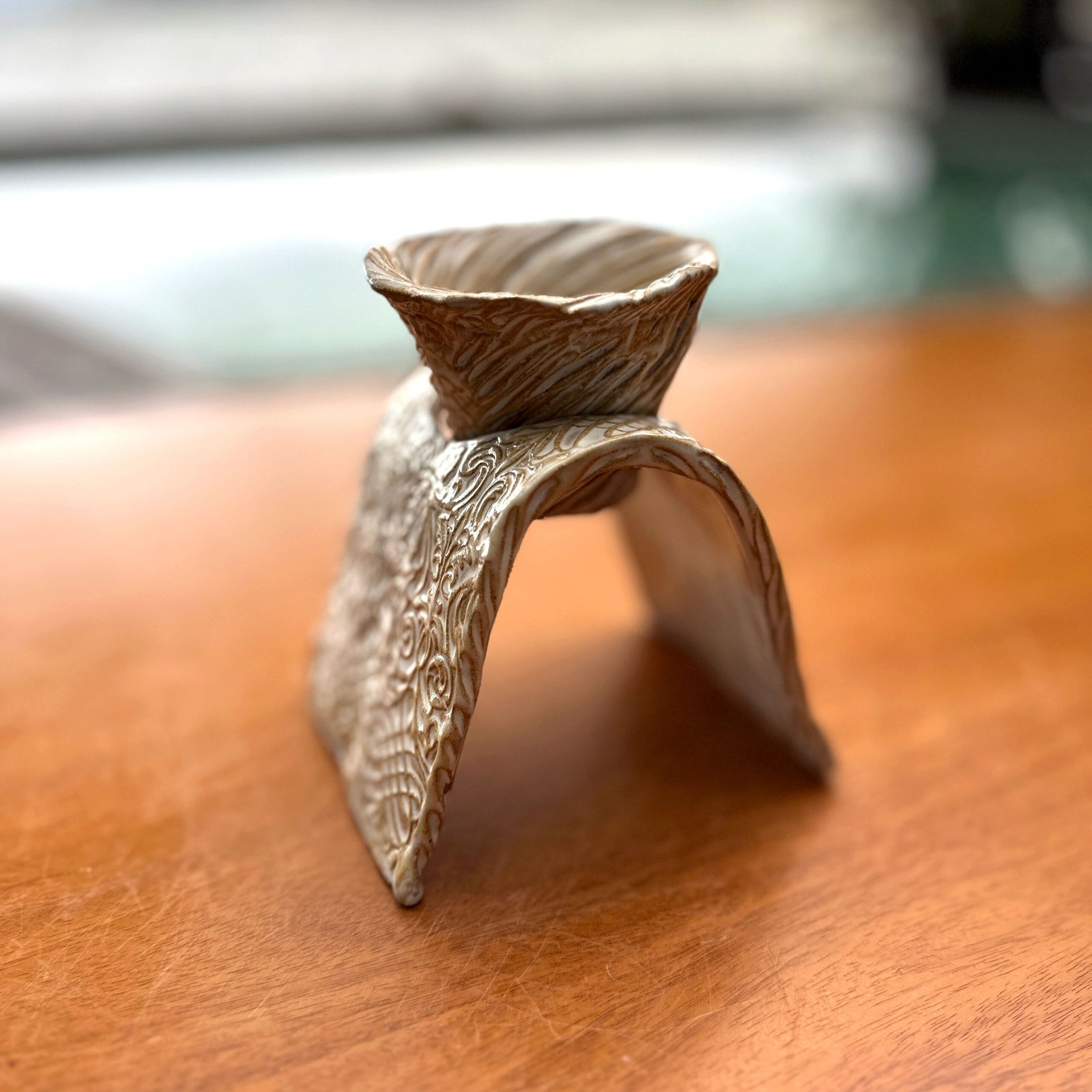 O design desta estação é definido pela técnica do esgrafito, onde sulcos rítmicos são entalhados na argila, criando uma topografia tátil que é um deleite para as mãos. A cor bege suave permite que o foco resida inteiramente no jogo de luz e sombra proporcionado pelas texturas esgrafitadas. O conjunto, composto por suporte de coador, canecas e jarra, apresenta uma harmonia visual orgânica, onde as formas parecem ter sido moldadas pelo vento e pela água. A experiência sensorial vai além da visão: sentir o relevo das ranhuras enquanto se aprecia o aroma do café cria uma conexão profunda com o material e com o processo criativo da artista.