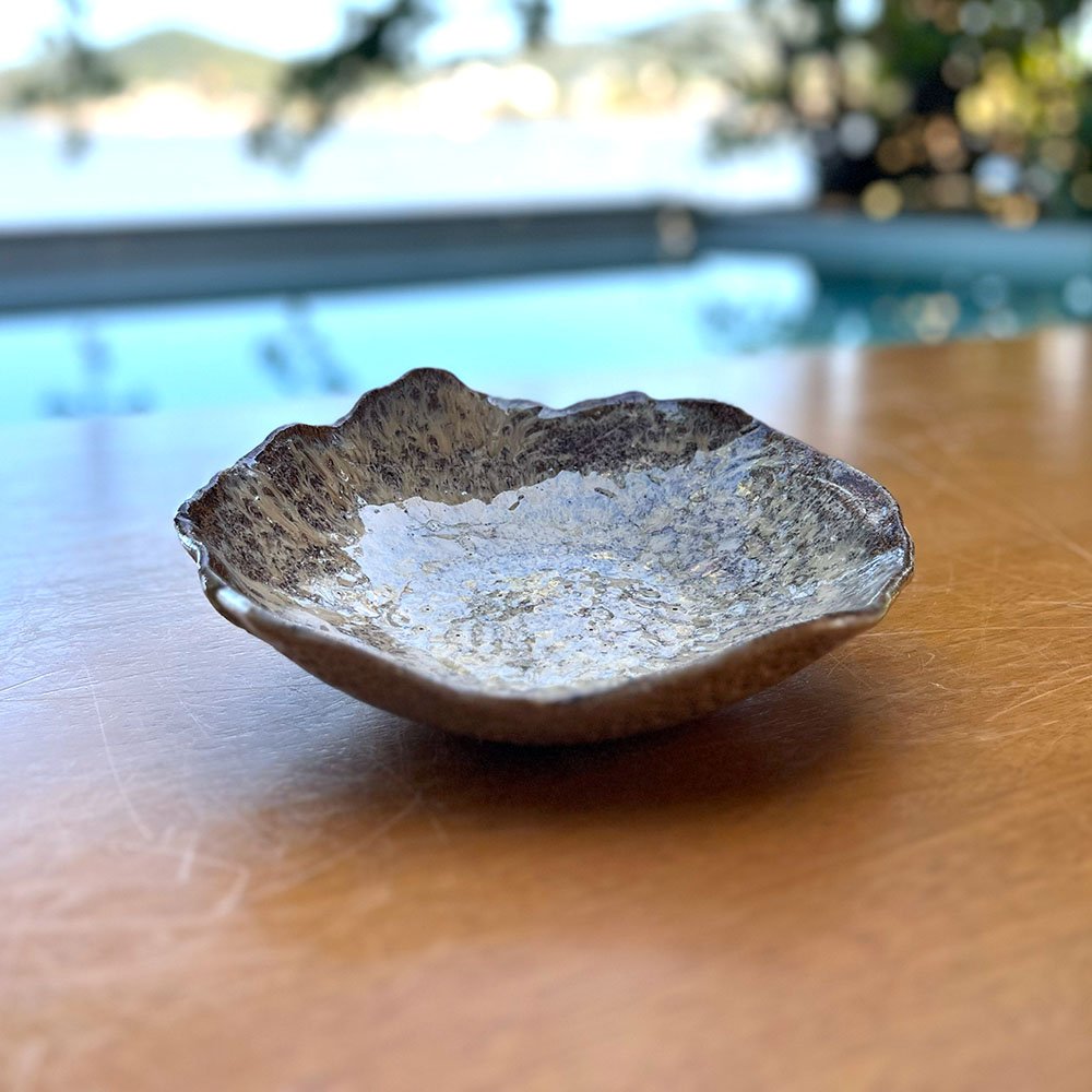 O design desta obra é uma experiência tátil e visual. O esmalte bege brilhante é salpicado por pontos minerais escuros (efeito speckled) que surgem espontaneamente durante a queima, criando uma textura visual rica e profunda. A borda, modelada livremente, apresenta contornos suaves e irregulares, oferecendo uma sensação de conforto e acolhimento ao segurar a peça. O contraste entre o brilho interno e a organicidade da forma torna este bowl um objeto de desejo para colecionadores e amantes do design artesanal.