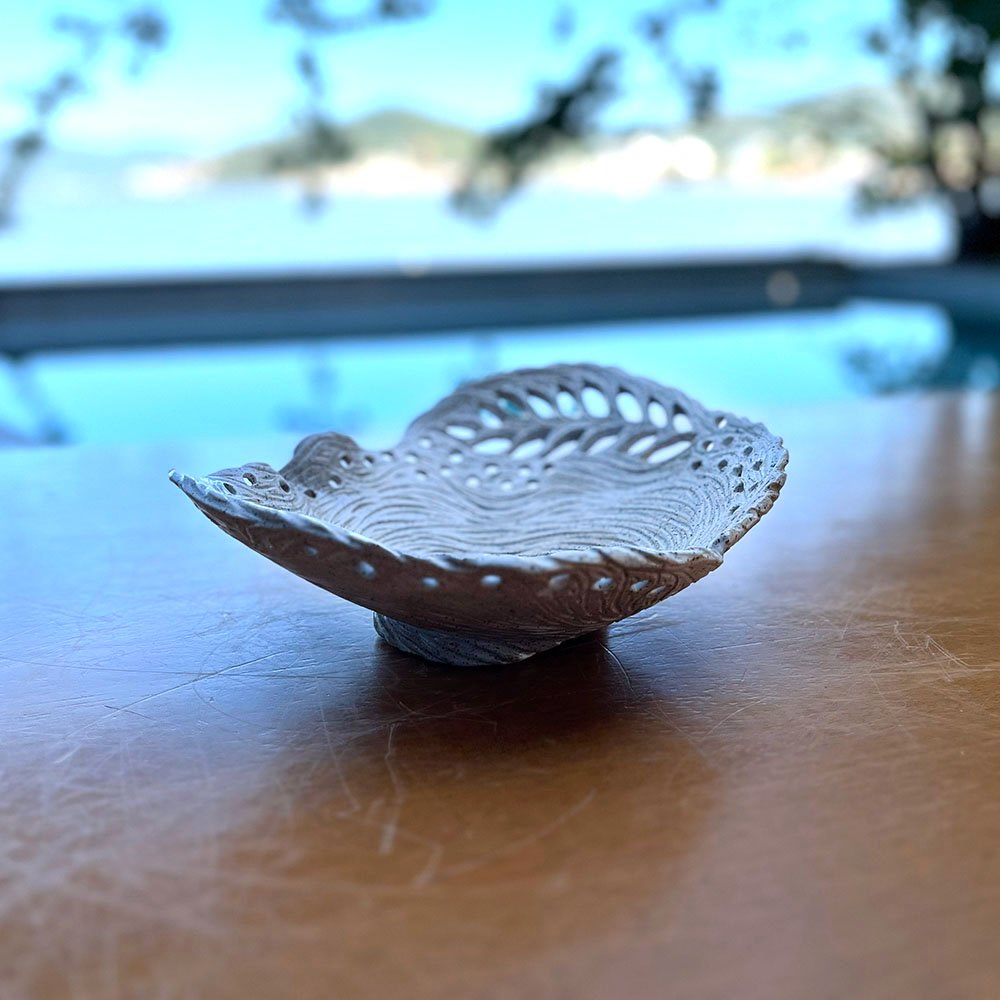 Processo: Modelagem orgânica com texturização central (esgrafito) e acabamento de borda vazada (openwork).