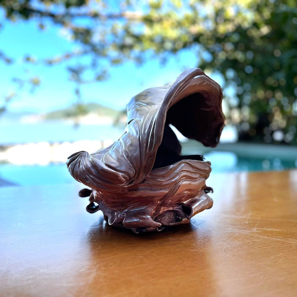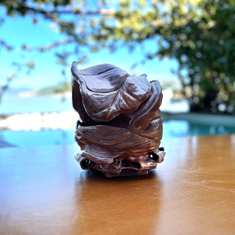 Esta peça não foi apenas moldada; ela parece ter nascido de um movimento telúrico. A Escultura de Cerâmica com Dobras Orgânicas Marrom representa a força da terra e a fluidez da água em um abraço eterno. Sua forma côncava e fechada sobre si mesma evoca a sensação de proteção, como um casulo ou uma concha marinha gigante devolvida pela maré. O esmalte de alto brilho em tons de marrom acobreado sugere a umidade da argila recém-trabalhada ou a pedra molhada de uma cachoeira, trazendo uma vitalidade orgânica e “molhada” para o interior seco da casa.