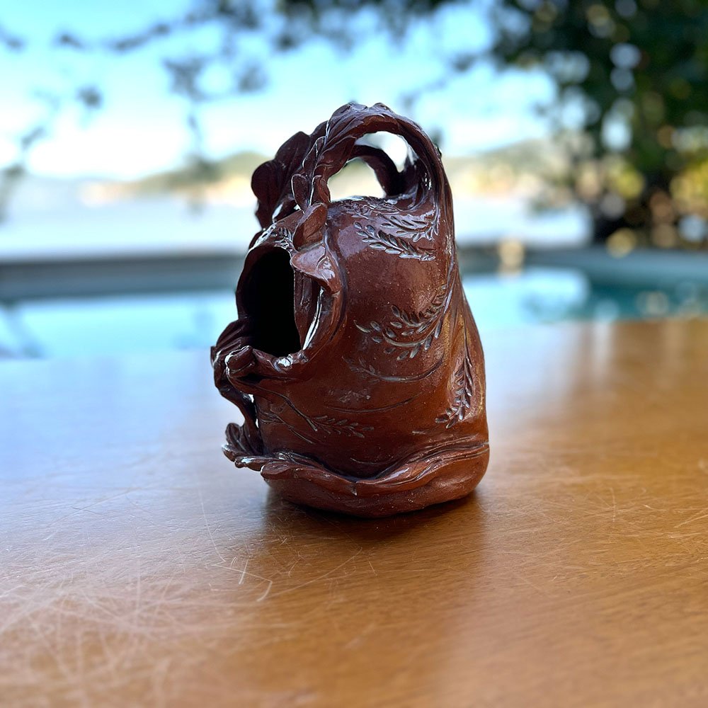 O design desta obra é dominado pela textura. A superfície é envolta por folhas esculpidas em alto relevo que parecem abraçar a forma principal, criando uma camada extra de profundidade visual e tátil. A alça superior, organicamente integrada, sugere mobilidade e leveza. O esmalte marrom, com nuances que lembram o couro envelhecido ou a terra molhada, confere à peça uma nobreza rústica. O contraste entre a parte externa texturizada e a escuridão misteriosa do interior cria um jogo de luz e sombra fascinante.