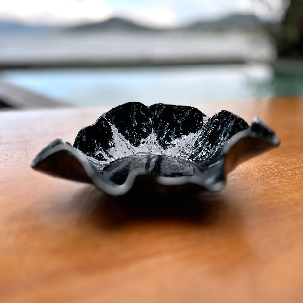 O design desta peça destaca-se pela fluidez indomável de suas bordas, que simulam o movimento orgânico das ondas sob o luar. O esmalte preto intenso possui uma vitrificação excelente, criando reflexos que remetem à superfície líquida e profunda do oceano à noite, atraindo o olhar para o seu centro misterioso e fascinante. Com um peso robusto de 2 kg, a peça entrega uma sensação tátil de solidez e luxo, equilibrando a força da cerâmica de alta temperatura com a leveza visual de suas curvas sinuosas. Cada contorno foi esculpido manualmente para que a luz percorra a superfície preta, revelando nuances da modelagem que tornam esta obra absolutamente singular.