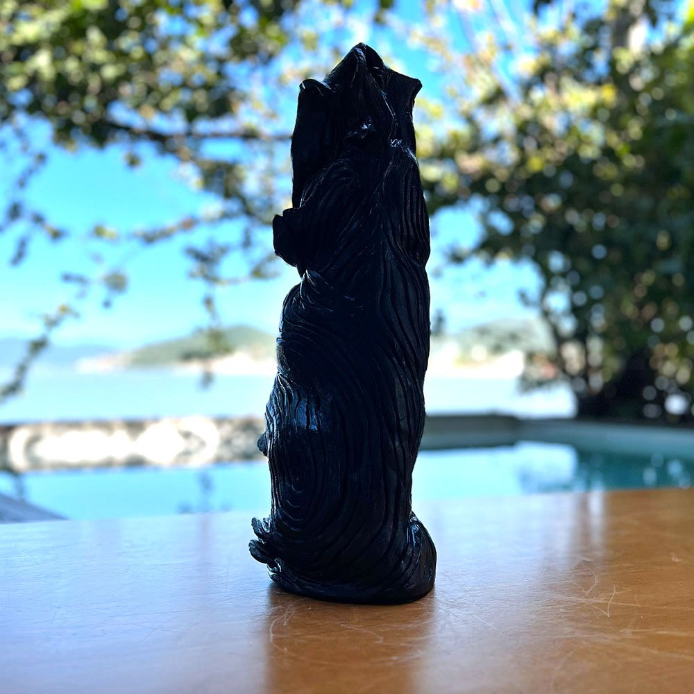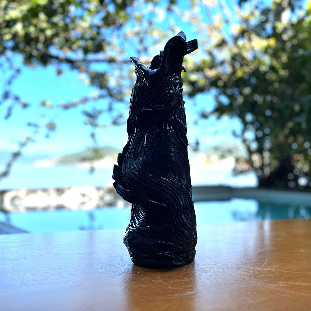 O acabamento em preto profundo confere sofisticação e mistério, transformando a peça em um ponto focal dramático que interage com a luz ambiente.