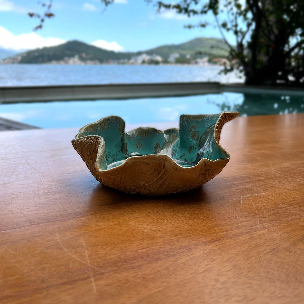 A alquimia do fogo torna cada centímetro desta peça irrepetível. A maneira como o esmalte turquesa interagiu com as bordas bronzeadas no Centro de Mesa de Cerâmica com Efeito Oxidado Turquesa é única desta unidade. Ao adquirir esta obra, você leva para casa um exemplar exclusivo, onde a natureza dos materiais e a mão do artista criaram uma pequena joia de identidade singular.