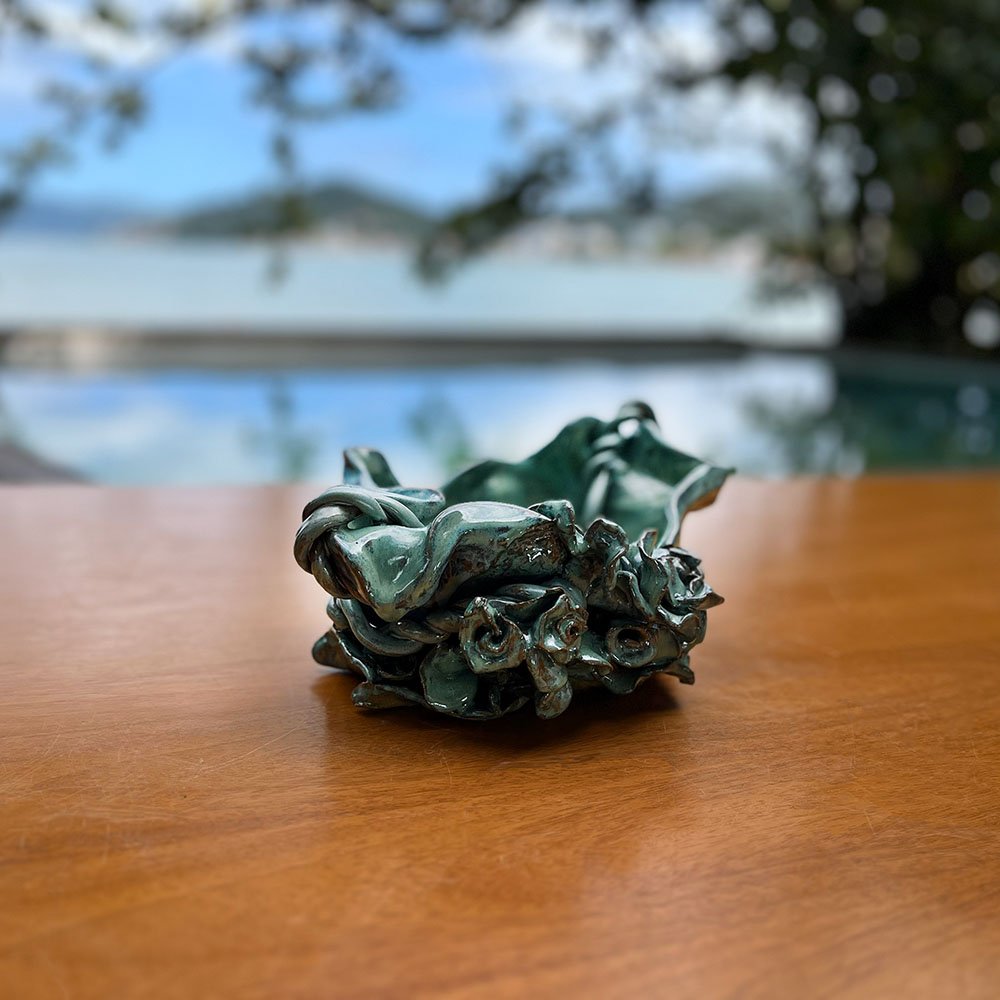 Esta peça é uma escultura que respira a brisa do oceano. Ela captura o exato momento de encontro entre a terra e o mar: a solidez das rochas marítimas abraçada pela fluidez das ondas. Sua forma não obedece a moldes industriais; ela flui livremente, mimetizando o movimento da água que esculpe a pedra ao longo do tempo. O tom verde, profundo e vitrificado no interior, reflete a luz como uma piscina natural, convidando o olhar a mergulhar em suas nuances.