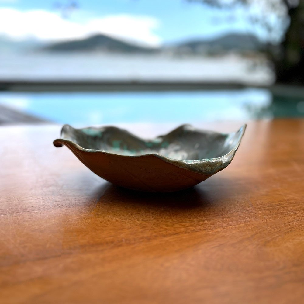 O design desta obra é marcado pela irregularidade intencional. Com 28 cm de largura, sua silhueta é fluida e assimétrica, recusando a perfeição da máquina. O esmalte reativo é o protagonista: uma base bronze escuro que se abre em nuvens de turquesa e verde-água no centro, criando uma profundidade visual hipnotizante. Ao toque, a peça oferece uma textura rica, variando entre a rugosidade das bordas “metálicas” e a suavidade vitrificada do interior, proporcionando uma experiência sensorial completa.